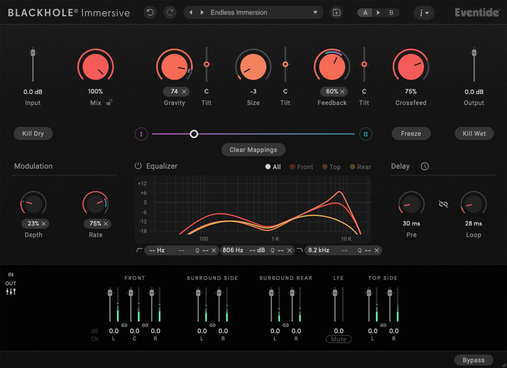 Designed from the ground up for immersive, Dolby Atmos, and surround workflows, Blackhole® Immersive expands the signature sound of Eventide’s stereo version across your entire immersive mix.